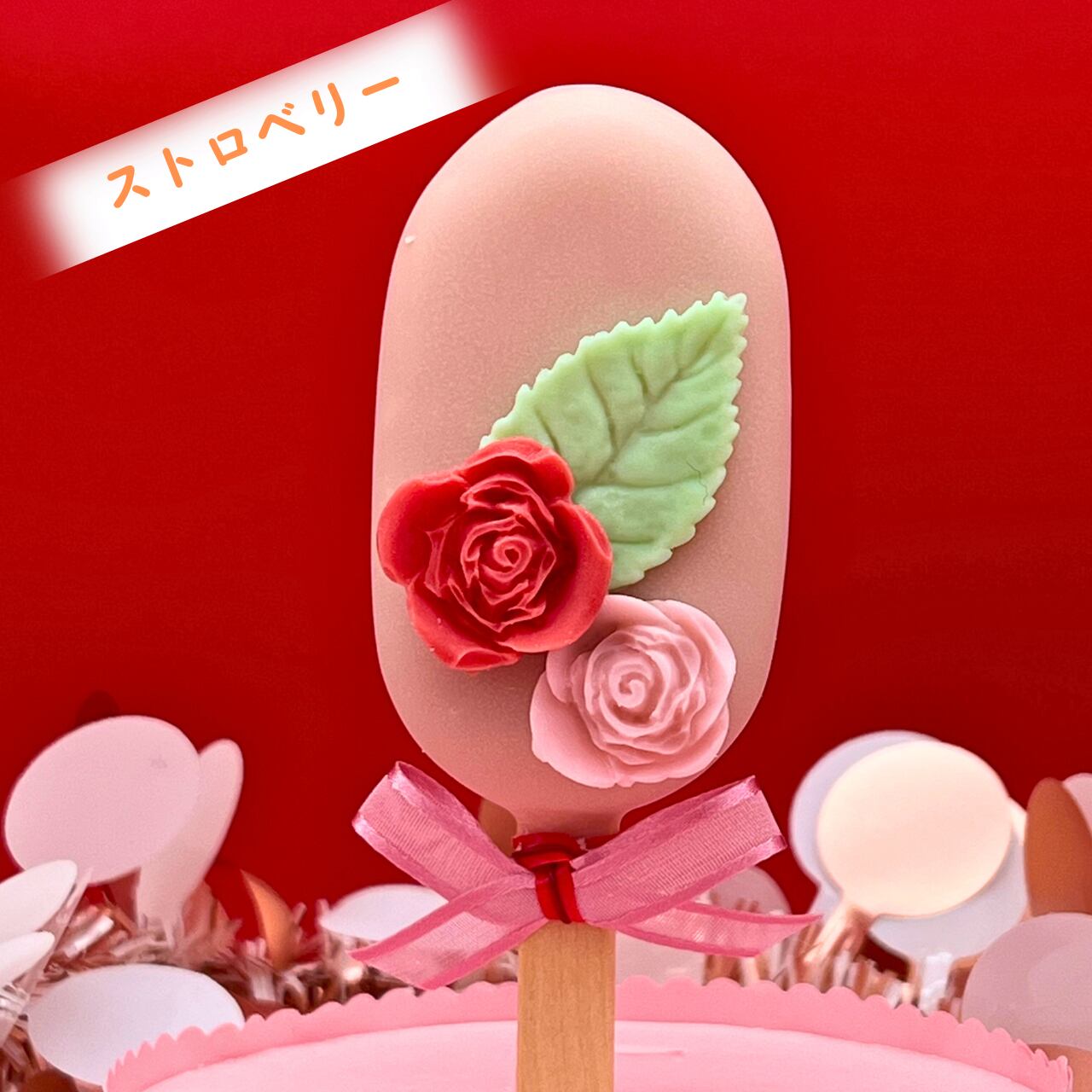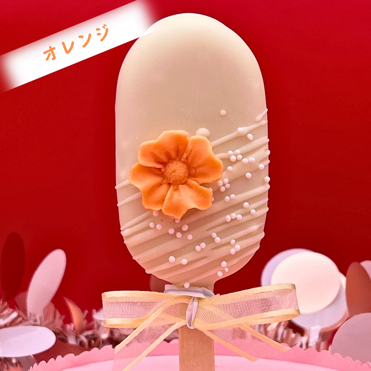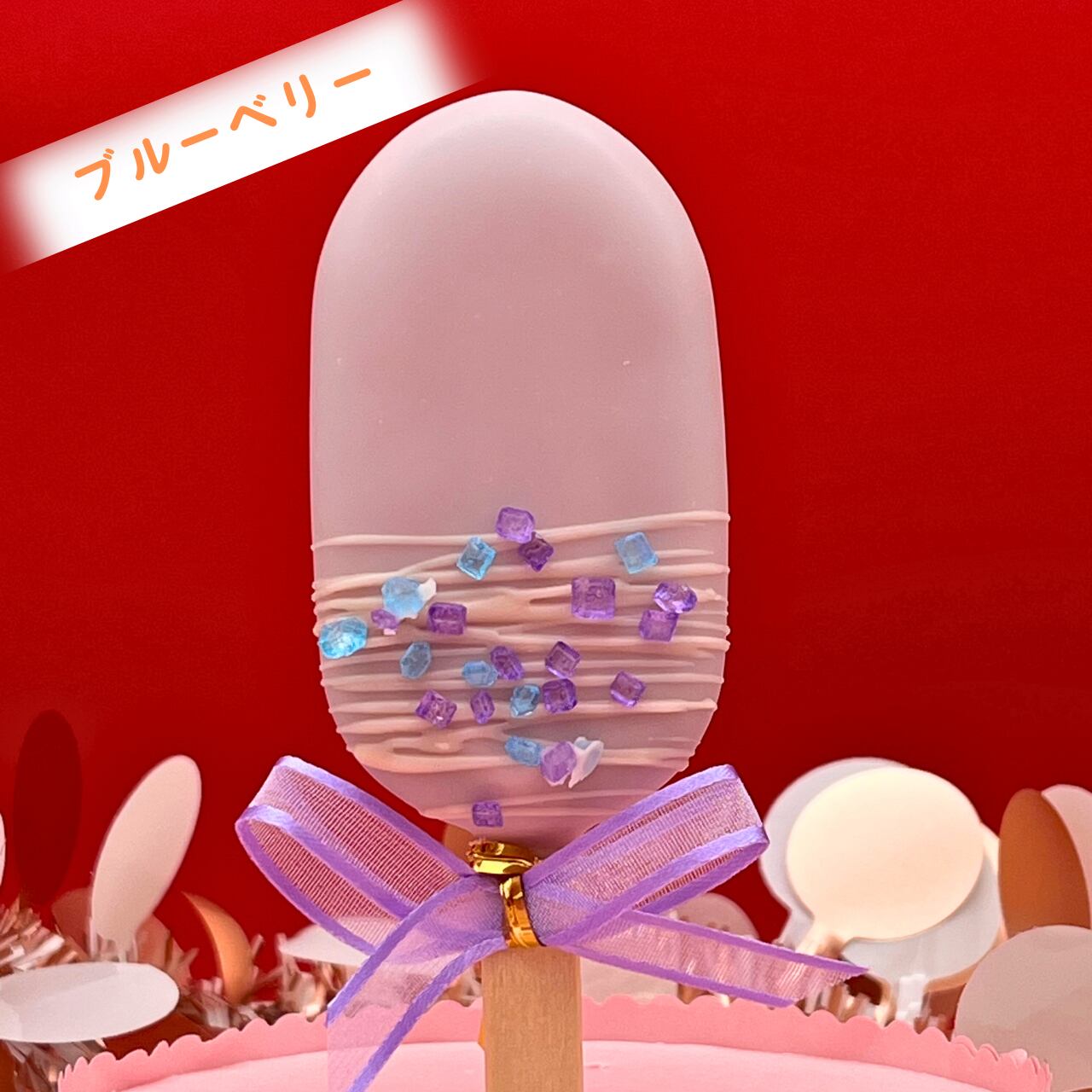お味はブルーベリー1本、ストロベリー1本、オレンジ1本、ココナツチョコレート1本の計4種類。アイスキャンディのような形にしてデコレーションを施し、フラワーアレンジメントのように円柱型のクリアBOXに入れてお届けいたします。
