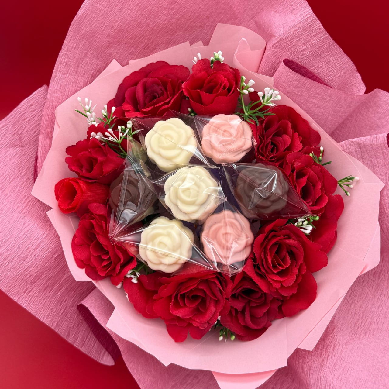 お味はストロベリー2本、オレンジ2本、珈琲2本、塩キャラメル1本の計4種類。造花の薔薇を組み合わせ花束の形にし、クリアBOXに入れてお届けいたします。
